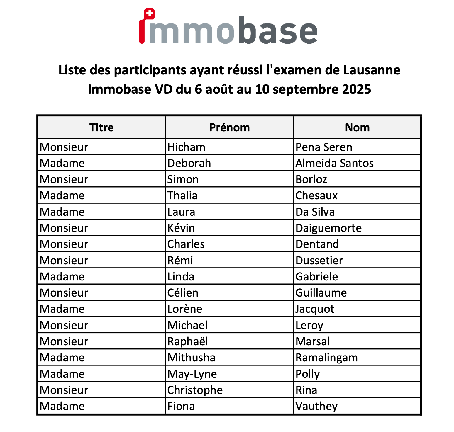 17 participant(e)s ayant suivi la formation Immobase à Lausanne en août et septembre 2025 obtiennent leur certification avec succès.