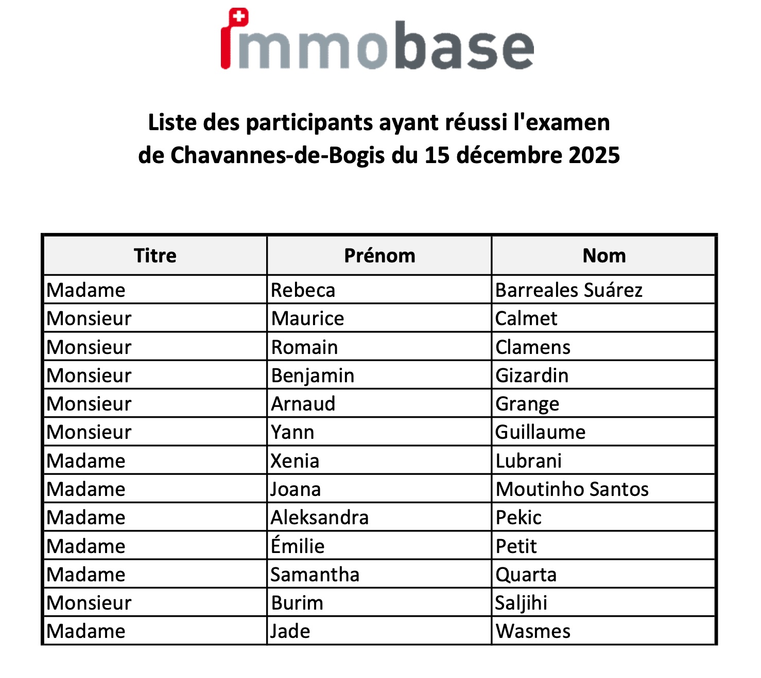 13 participant(e)s ayant passé l’examen Immobase du 15 décembre 2025 à Chavannes-de-Bogis obtiennent leur certification avec succès.