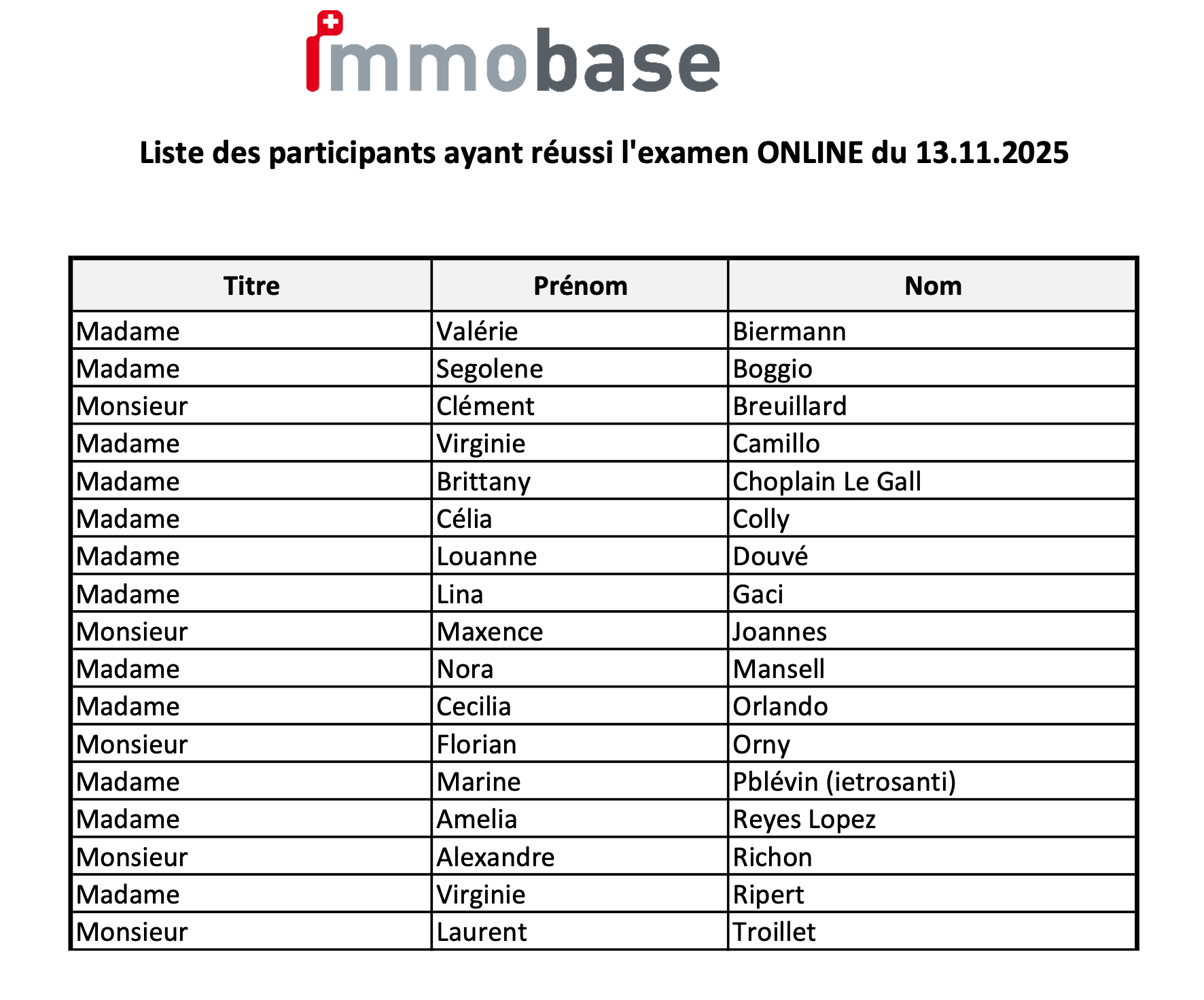 17 participant(e)s ayant suivi la formation Immobase online de septembre à décembre 2025 obtiennent leur certification avec succès.