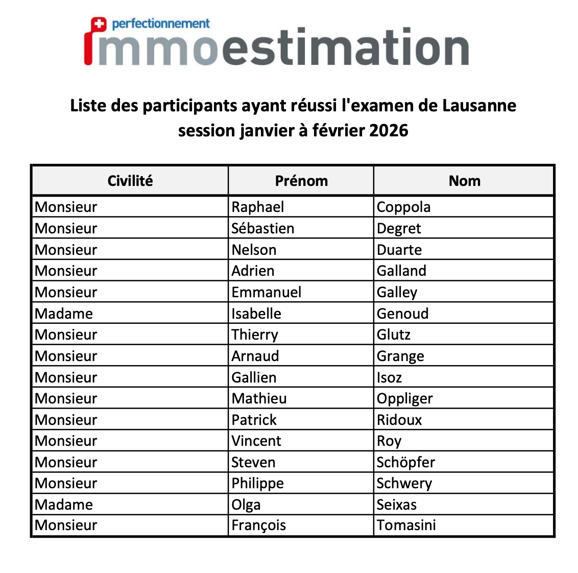 16 participant(e)s ayant suivi la formation Immoestimation en janvier-février 2026 obtiennent leur certification avec succès.