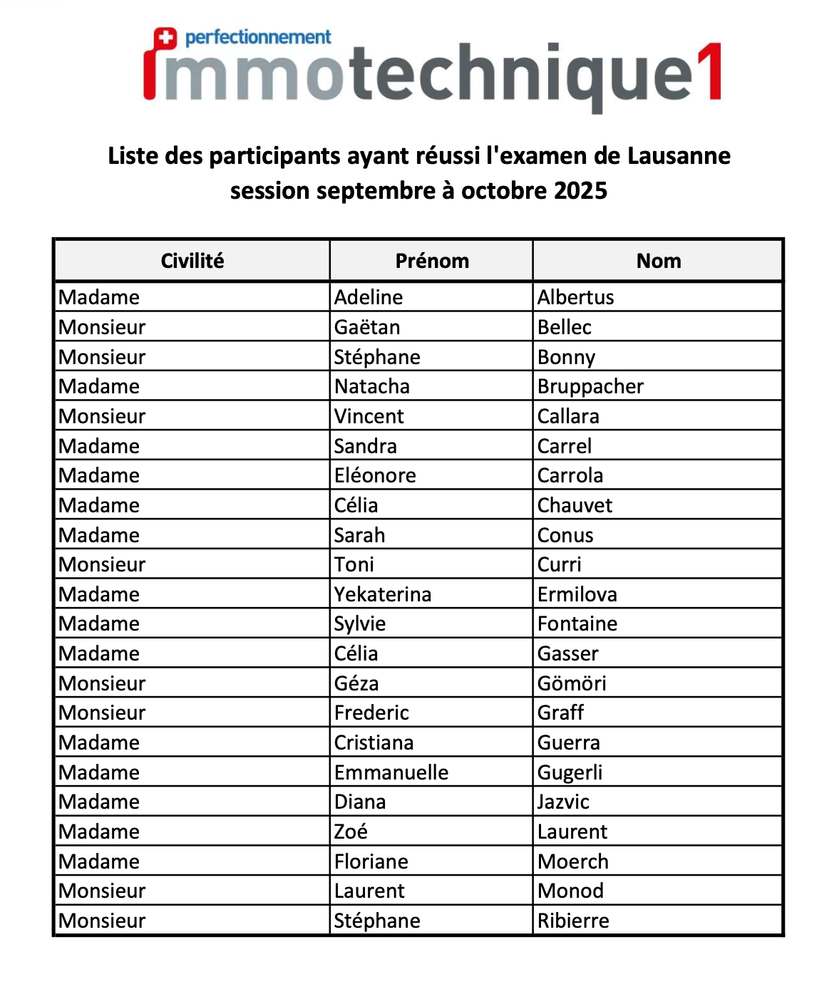 22 participant(e)s ayant suivi la formation Immotechnique 1 en septembre – octobre 2025 obtiennent leur certification avec succès.